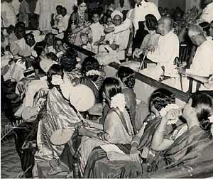 Rajagopalachari. Seated in the audience (from right to left) are Mrs Kalki Krishnamurti, Bharat Ratna M.S.Subbulakshmia and Anandhi (Kalkis' daughter). To the other extreme, turning around is Radha (Sadhasivam's daughter). Sadasivam and Kalki were close friends and Tamil patriots of India. The latter was also the famous author of one of the most coveted Tamil Magazines. |